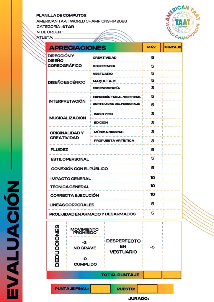 9.Partener´s: En caso de contar con 1 (uno) o varios partners se evaluara solo al “Atleta STAR” en el contexto de la performance.